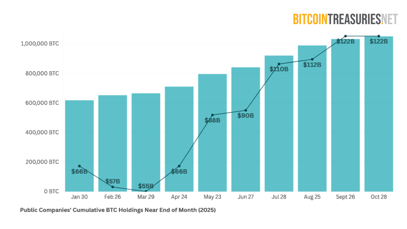 Yet steady accumulation has paid off. As Bitcoin prices hit $115,907 on Oct. 28, public treasury holdings were worth close to $122 billion. That’s 1.85x growth in USD value since the end of January against a 1.7x increase in Bitcoin holdings over the same period.