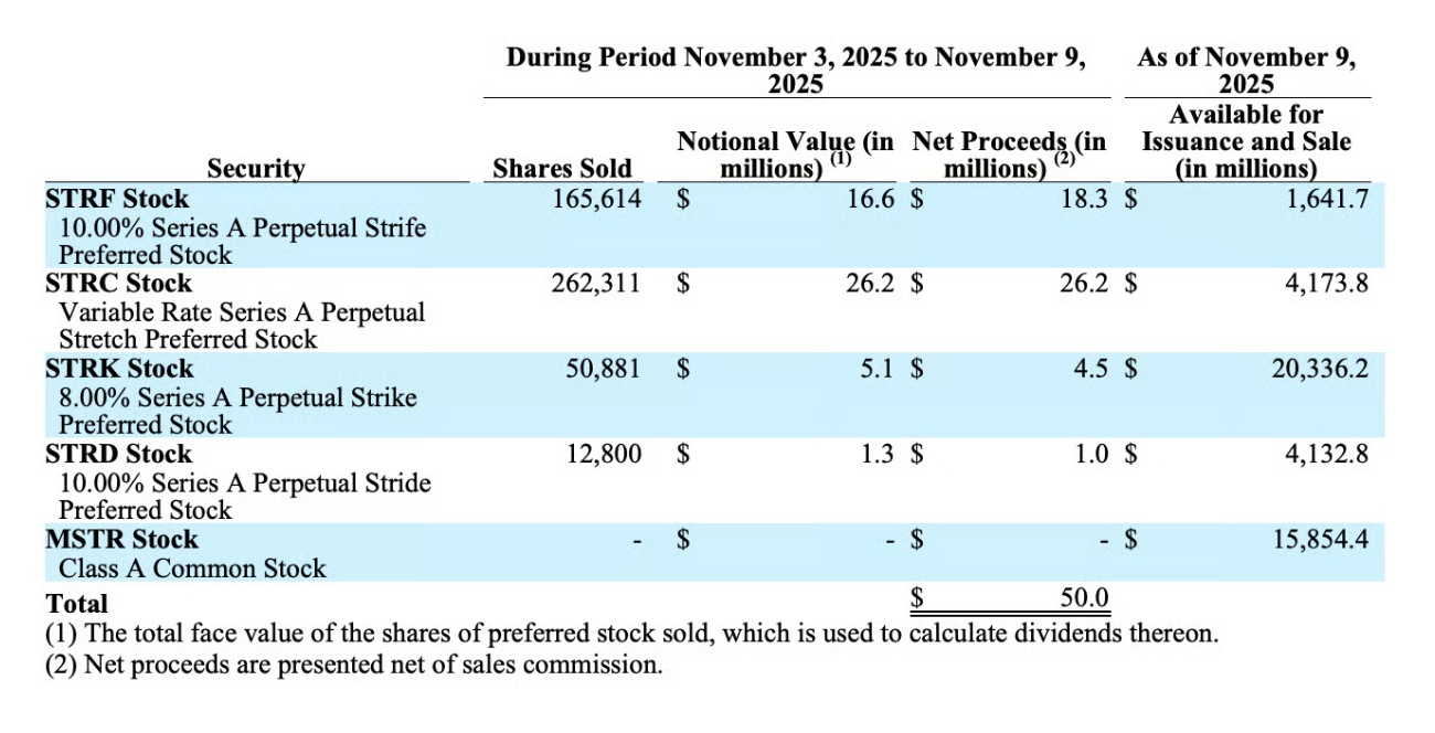 Moreover, the significance extends far beyond the $50 million capital raise. Strategy’s November 3-9 securities filing reveals the company sold 262,311 shares of STRC at par value, generating $26.2 million in net proceeds. Simultaneously, it issued STRF ($18.3 million), STRK ($4.5 million), and STRD ($1 million ) preferred tranches while selling zero MSTR common shares.